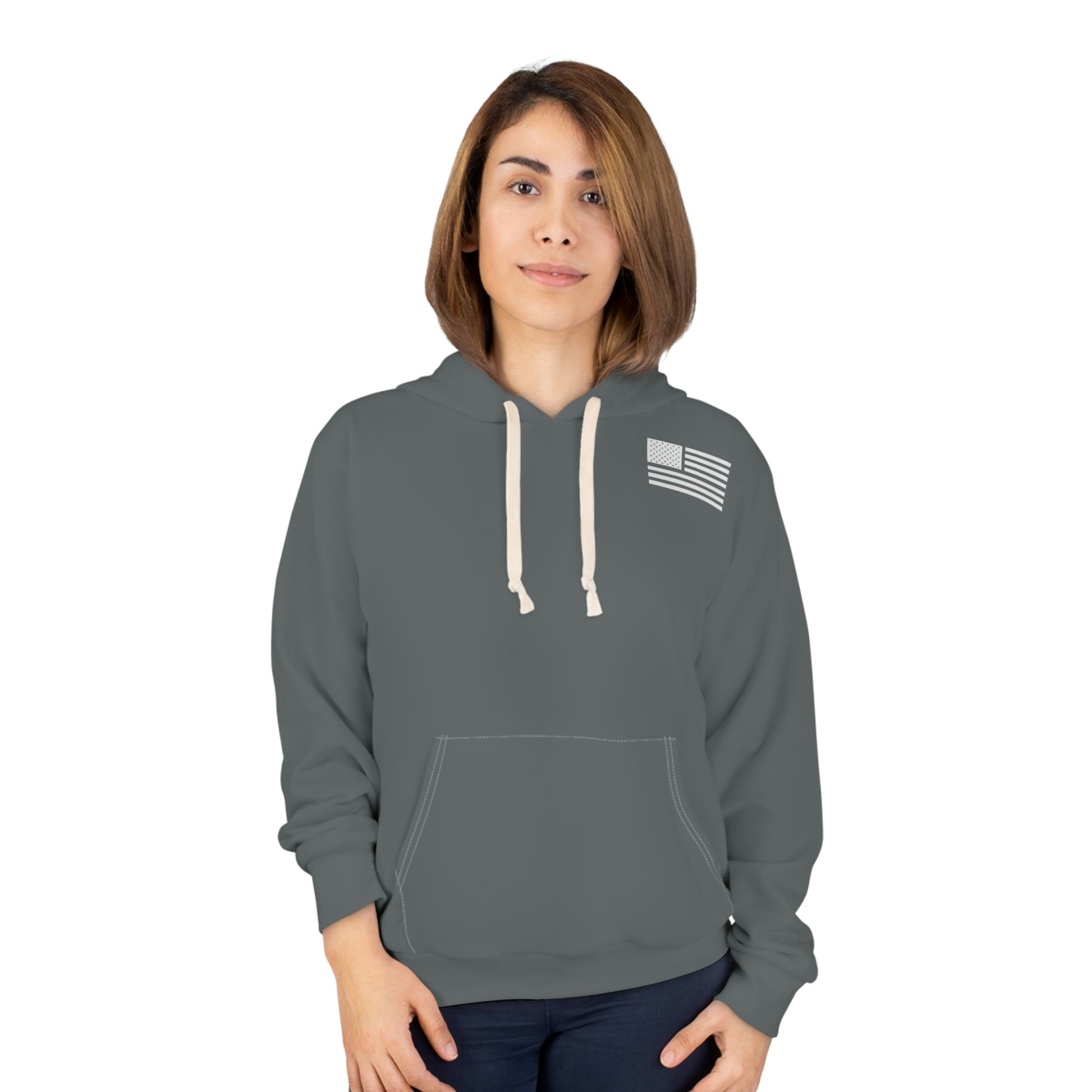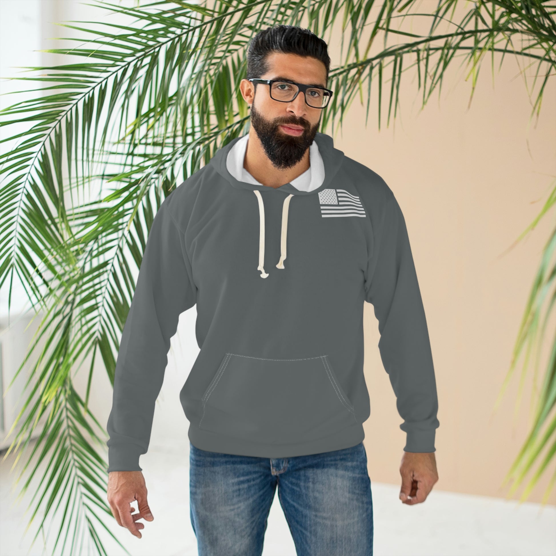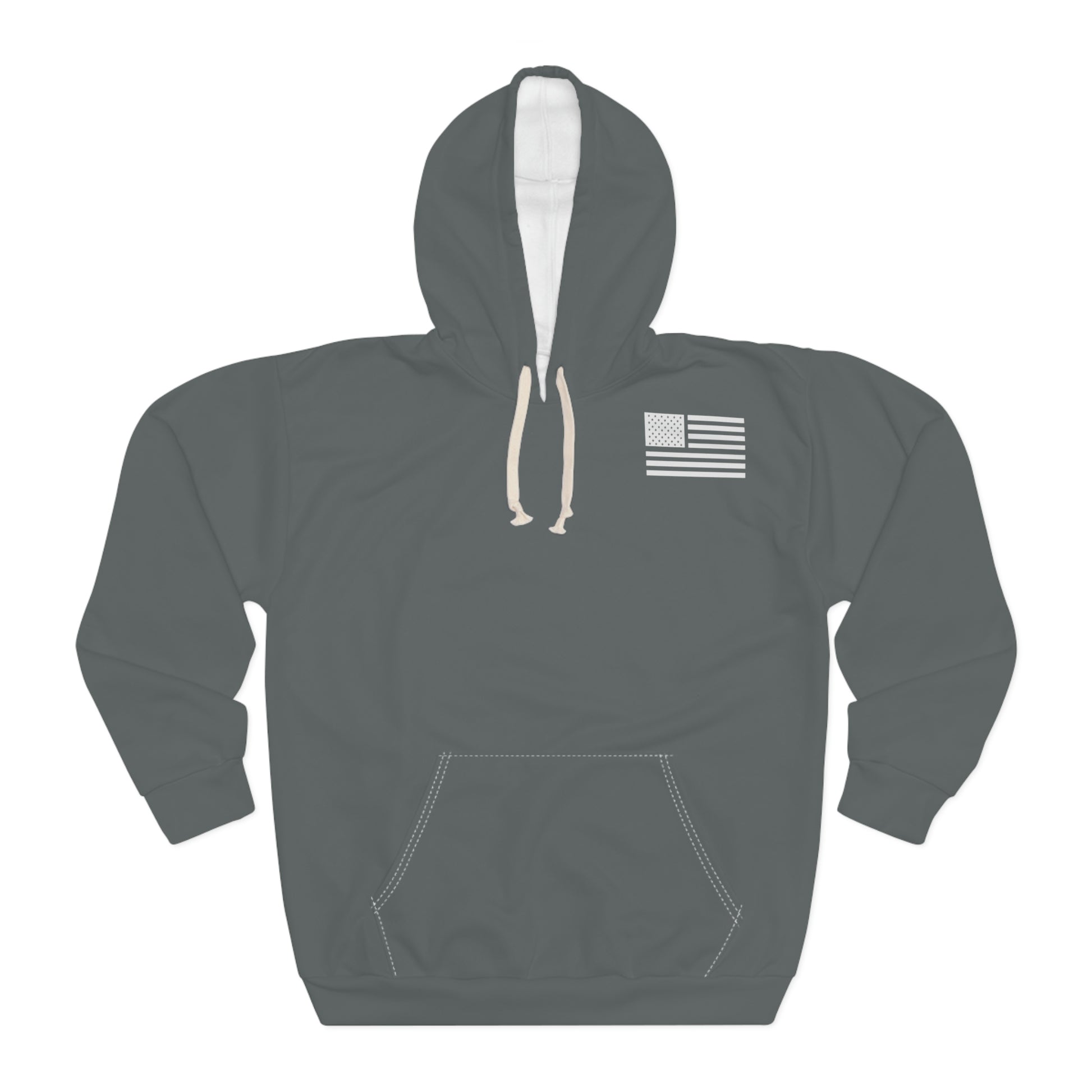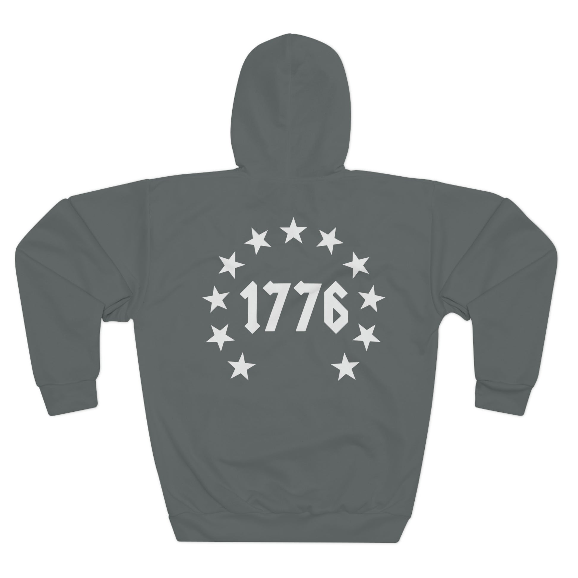 The 1776 - Flag Dark Grey hoodie features long sleeves, a front kangaroo pocket, a hood, and front, back, and right arm graphics.