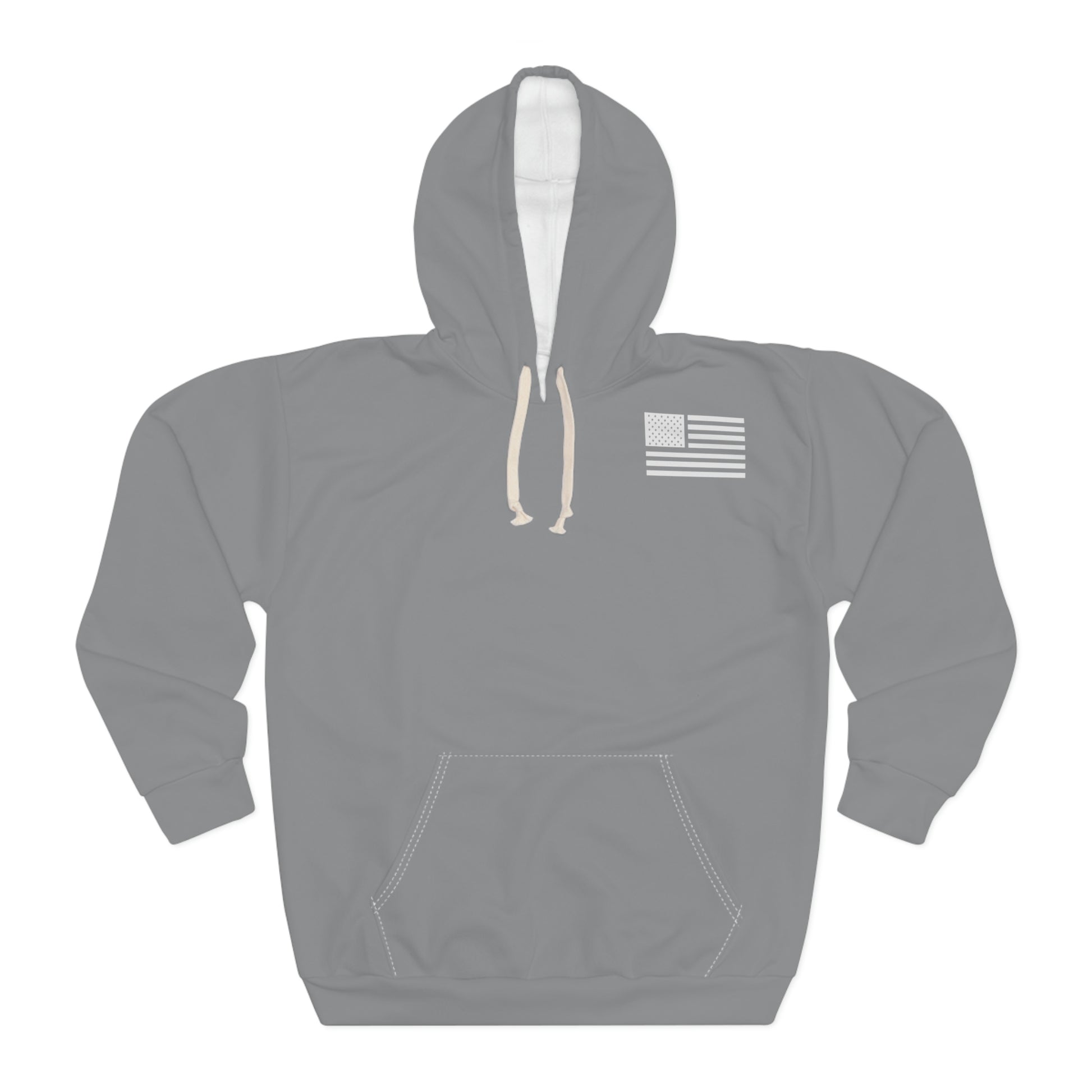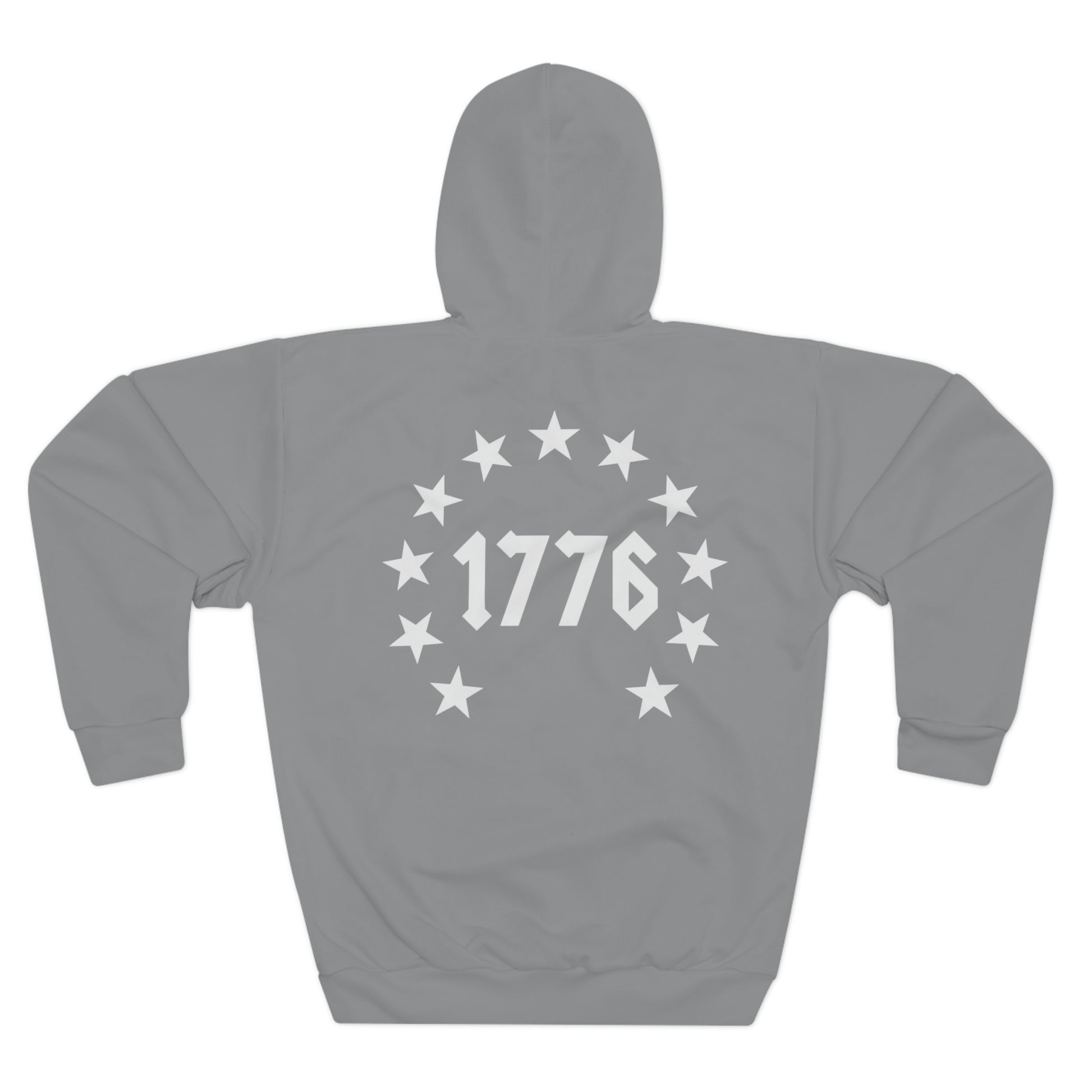 The 1776 - Flag Grey hoodie features long sleeves, a front kangaroo pocket, a hood, and front, back, and right arm graphics.